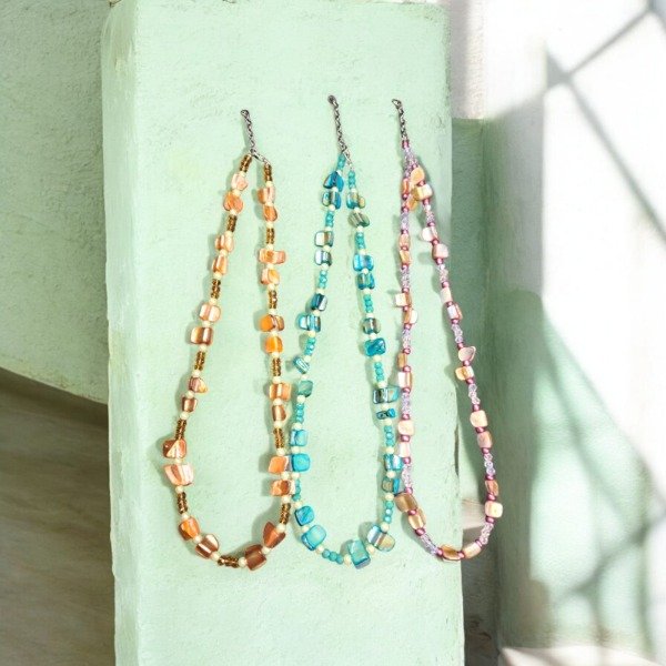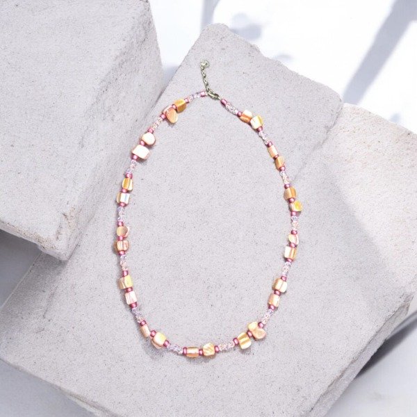 Collar cristales, mostacillas y nácar (con cadenita extensora). Diseño original. Hecho a mano.