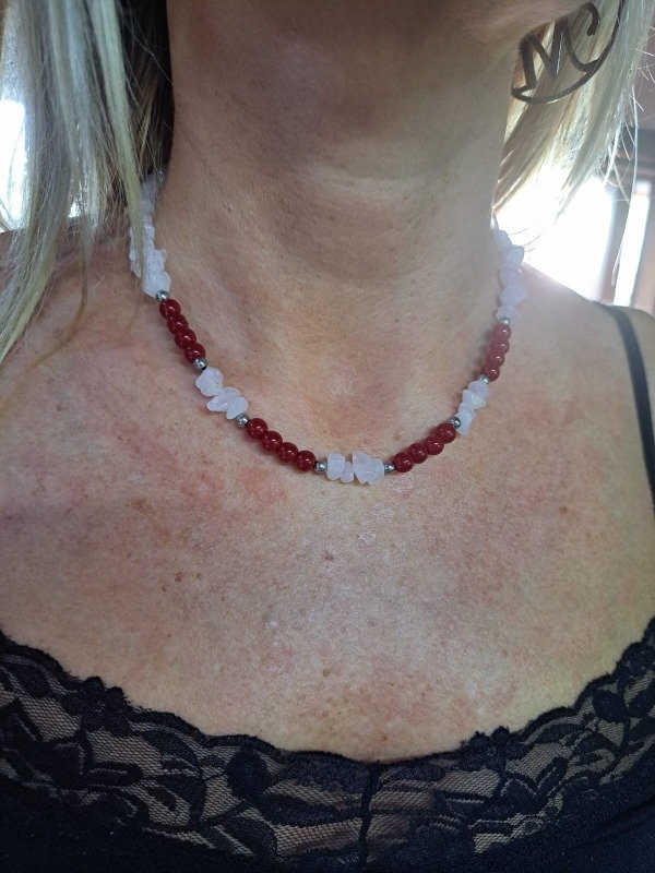 Collar cuarzo rosa y coral rojo (con cadenita extensora). Diseño original. Hecho a mano.