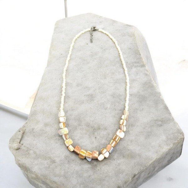 Collar nácar y mostacillas (con cadenita extensora). Diseño original. Hecho a mano.