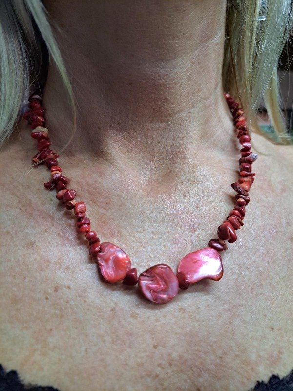 Collar coral rojo y nácar (con cadenita extensora). Diseño original. Hecho a mano.